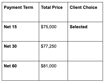 The client’s finance team chose Net 15 across all milestones. The transparent pricing made them realize they were better off managing their own cash than paying a premium. Instead of the agency waiting 17 weeks to collect the full balance, they received steady cash flow throughout the 12-week project.